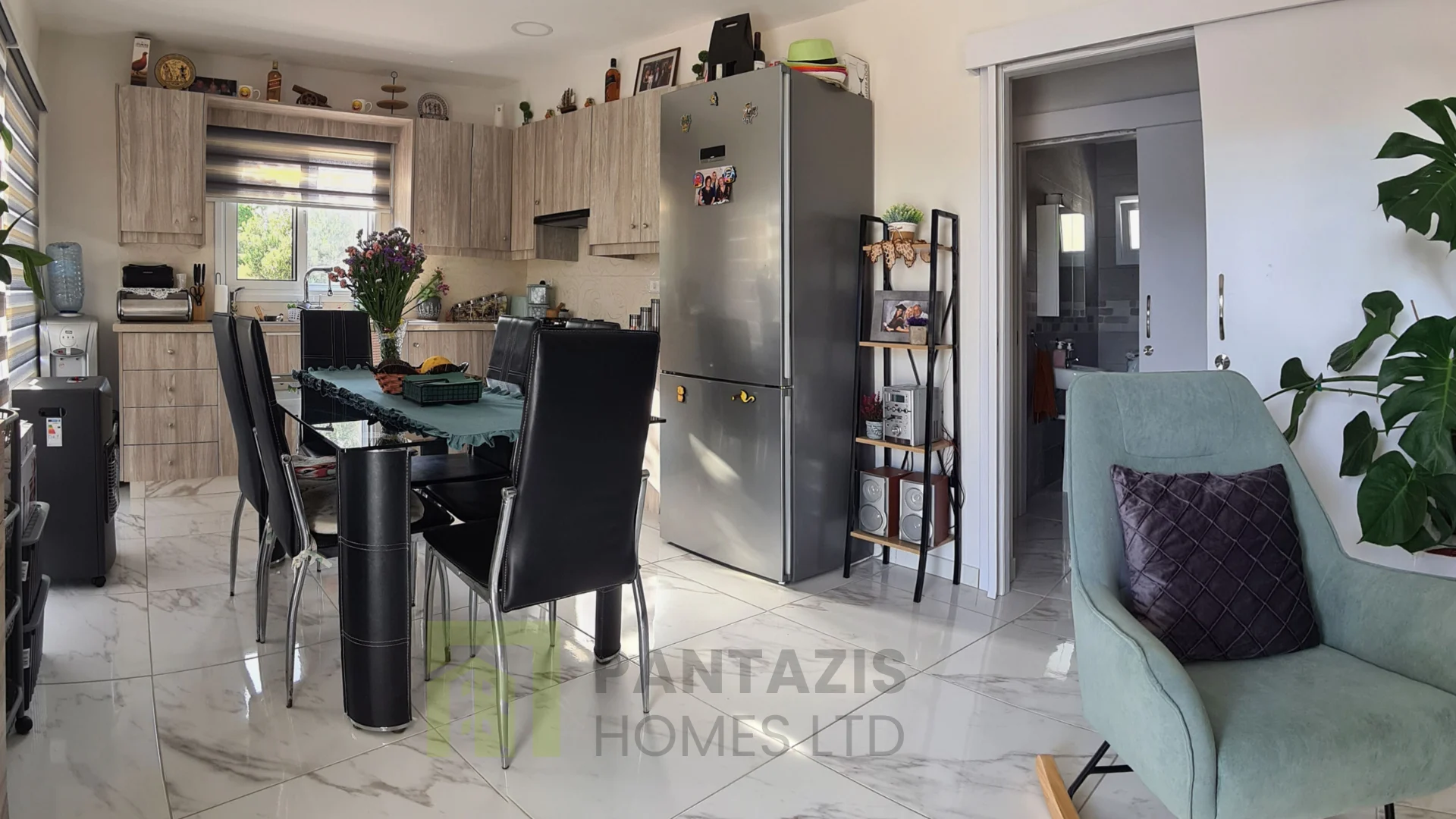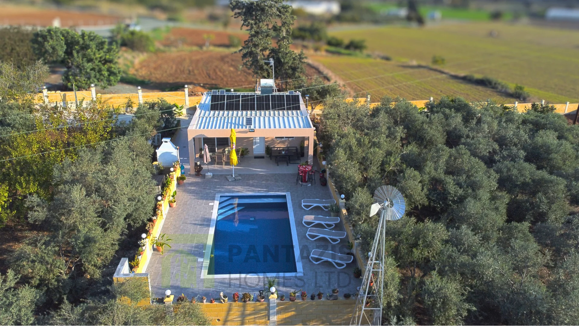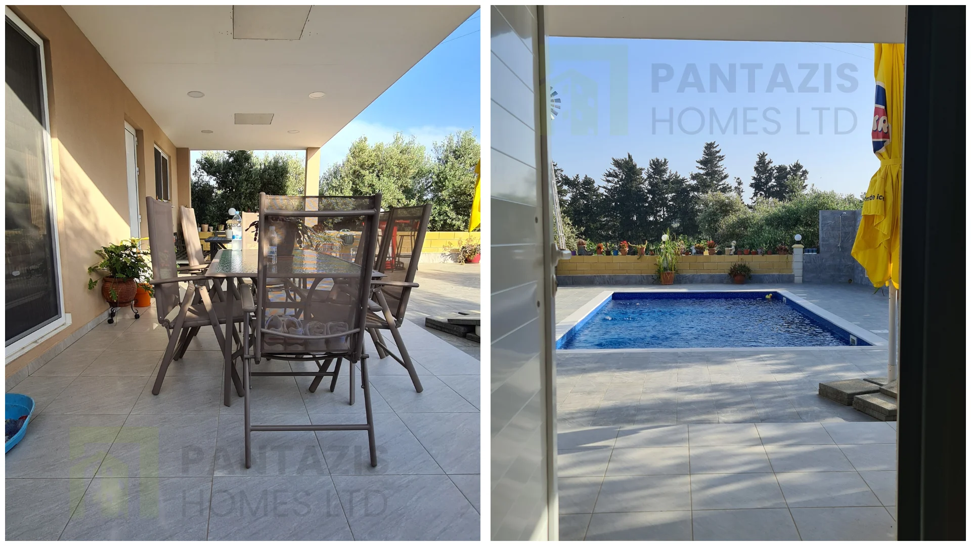 Στον εξωτερικό χώρο, η πισίνα προσθέτει πολυτέλεια και αναψυχή, μετατρέποντας το σπίτι σε ένα ήρεμο καταφύγιο για ξεκούραση ή φιλοξενία φίλων. Ο γύρω χώρος έχει διαμορφωθεί προσεκτικά, με πλακόστρωση και φυτά, δημιουργώντας μια όμορφη και καθαρή αισθητική που δένει αρμονικά με το κυπριακό τοπίο.