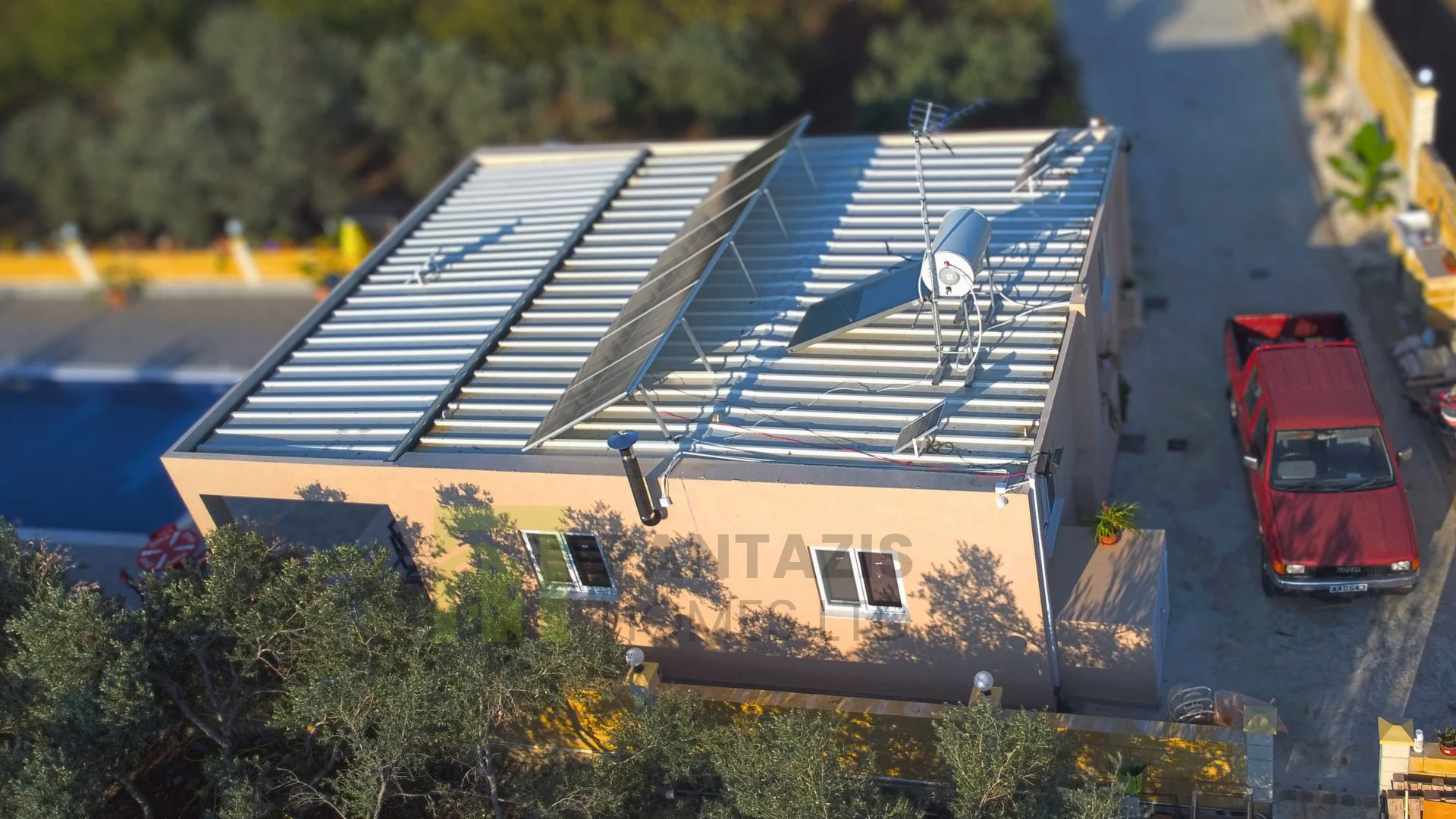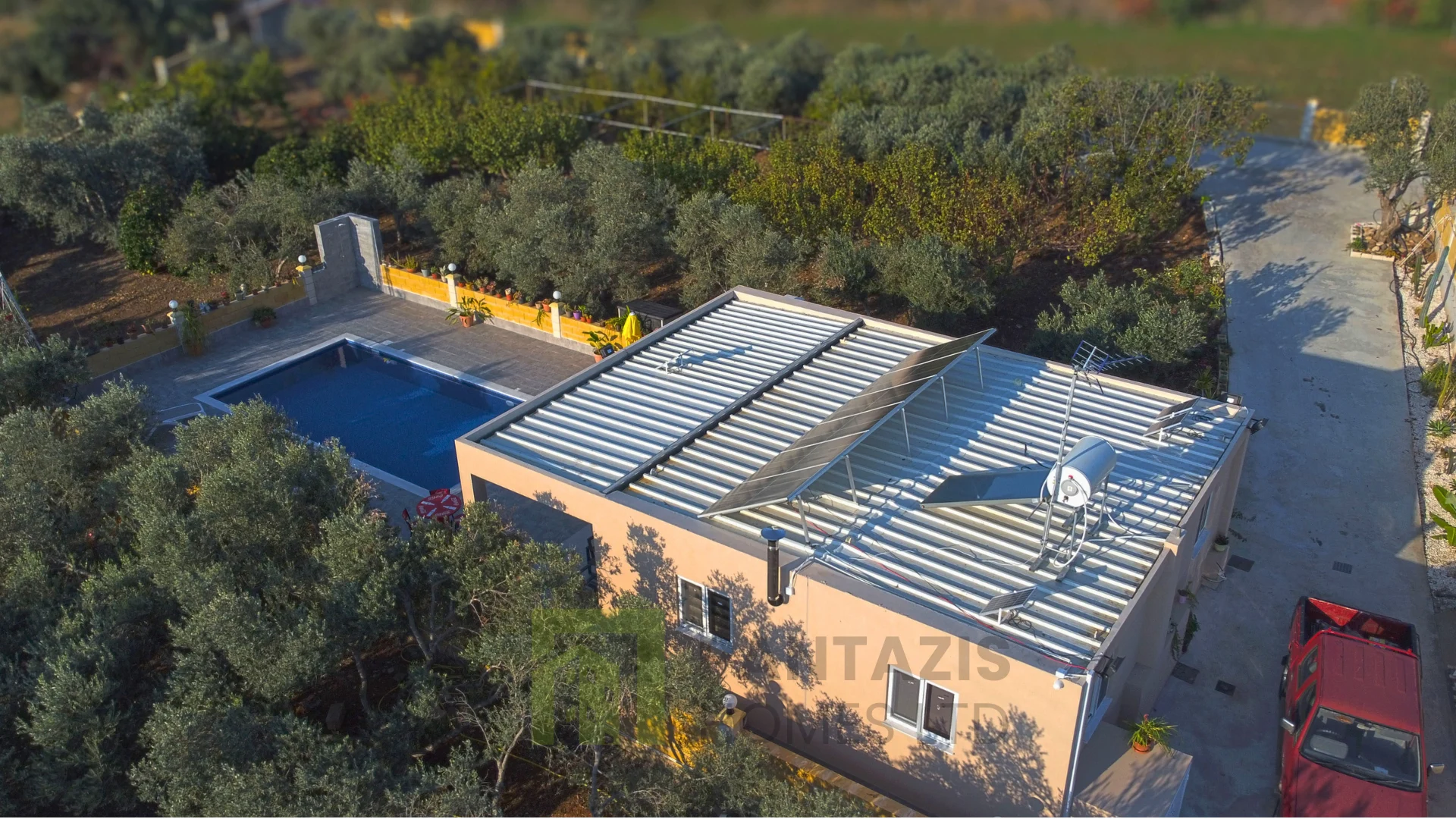 Η οροφή έχει σχεδιαστεί με προδιαγραφές για την τοποθέτηση φωτοβολταϊκών πάνελ, καθιστώντας το σπίτι ενεργειακά αυτόνομο και φιλικό προς το περιβάλλον. Ο συνδυασμός μεταλλικής σκεπής και θερμομόνωσης προσφέρει μέγιστη προστασία από τις καιρικές συνθήκες και εξαιρετική ενεργειακή απόδοση.